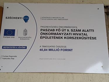donczene, 2018, július 6 - 16:30Paszab, Fő út 9. szám alatti Önkormányzati Hivatal épületének korszerűsítése TOP-3.2.1-15 című projekt tábla elhelyezése.